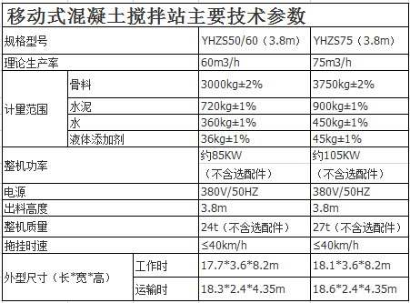 移動式混凝土攪拌站型號字母含義:YHZS中:Y-移動式、H-混凝土、Z-攪拌站、S-采用雙臥軸主機;因此其正式名稱為"移動式混凝土攪拌站"。簡稱"移動式攪拌站"。